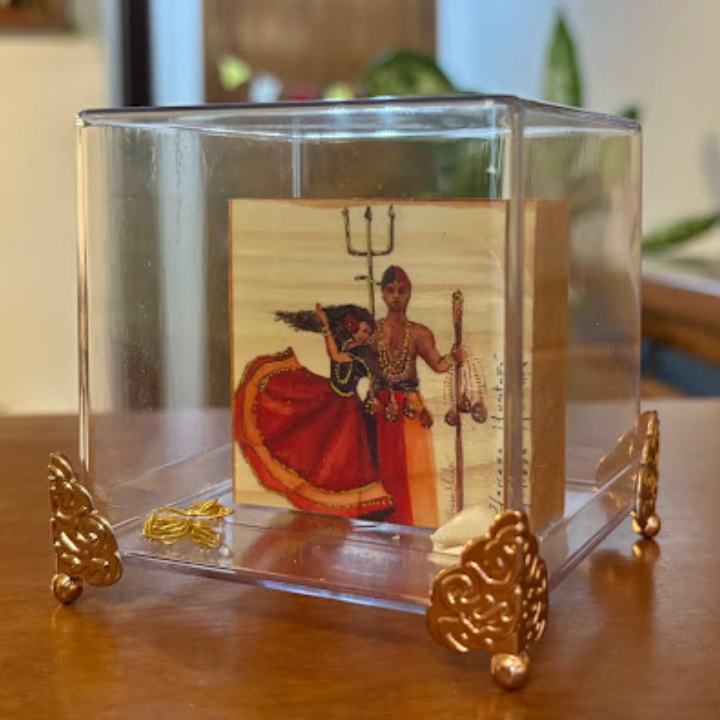 Peça em pinus cru (6x6x2cm) com reprodução de aquarela da artista Clarissa Mustafá em adesivo vinílico, dentro de caixa de acrílico 8x8cm