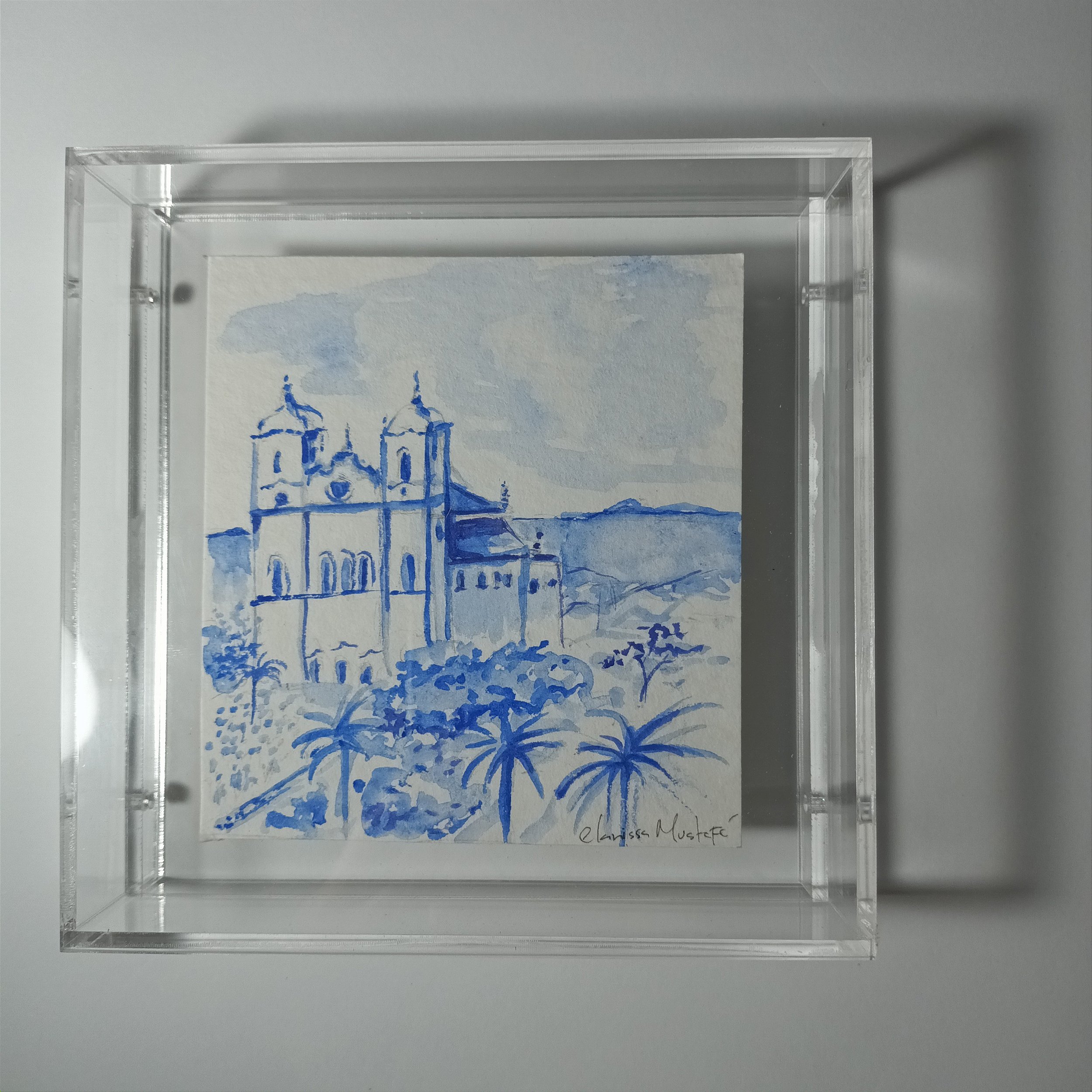 Arte impressa em papel vergê 220g/m² em moldura de acrílico tipo caixa 15x15cm