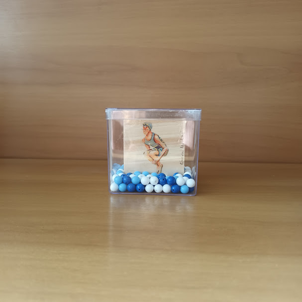 Peça em pinus cru (6x6x2cm) com reprodução de aquarela da artista Clarissa Mustafá em adesivo vinílico, dentro de caixa de acrílico 8x8cm