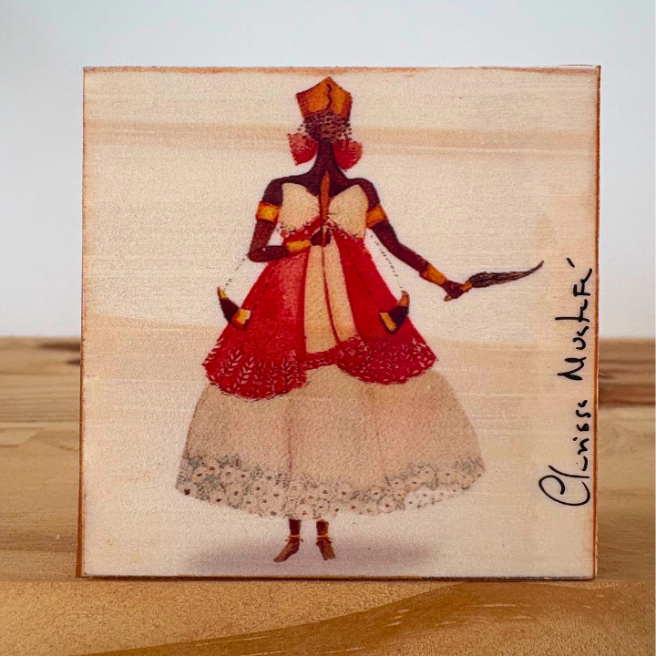 Peça em pinus cru (6x6x2cm) com reprodução de aquarela da artista Clarissa Mustafá em adesivo vinílico.
