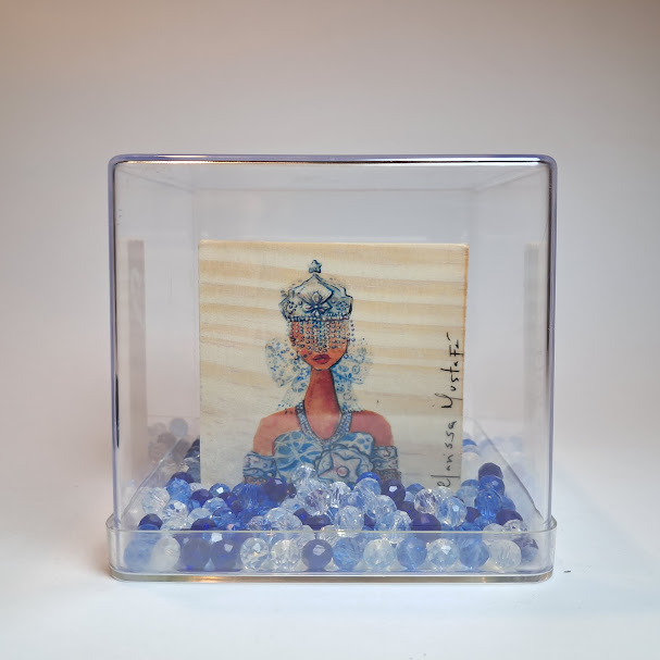 Peça em pinus cru (6x6x2cm) com reprodução de aquarela da artista Clarissa Mustafá em adesivo vinílico, dentro de caixa de acrílico 8x8cm