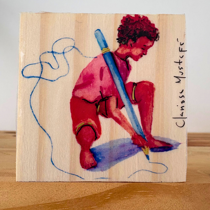 Peça em pinus cru (6x6x2cm) com reprodução de aquarela da artista Clarissa Mustafá em adesivo vinílico.
