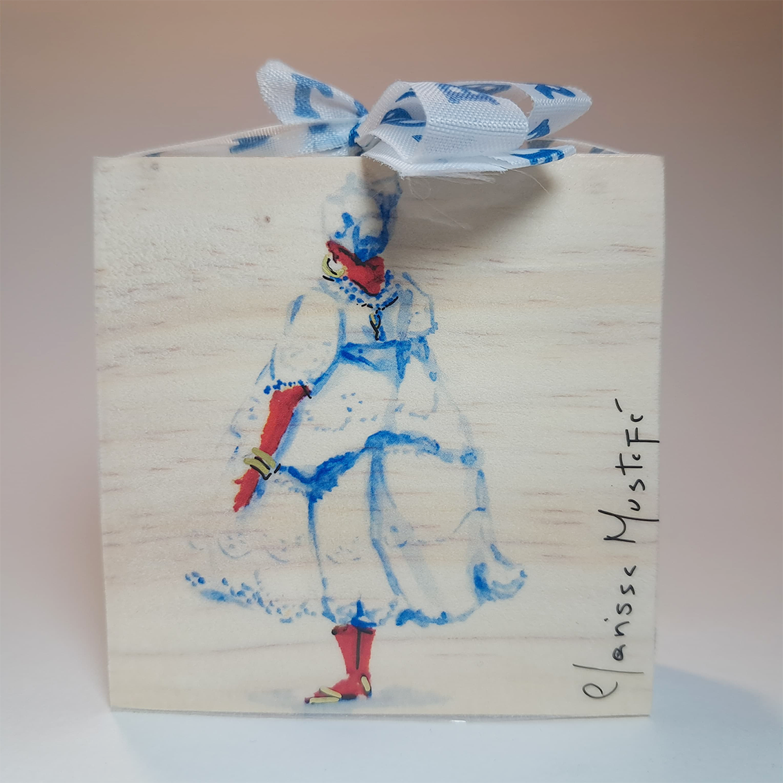 Peça em pinus cru (6x6x2cm) com reprodução de aquarela da artista Clarissa Mustafá em adesivo vinílico.