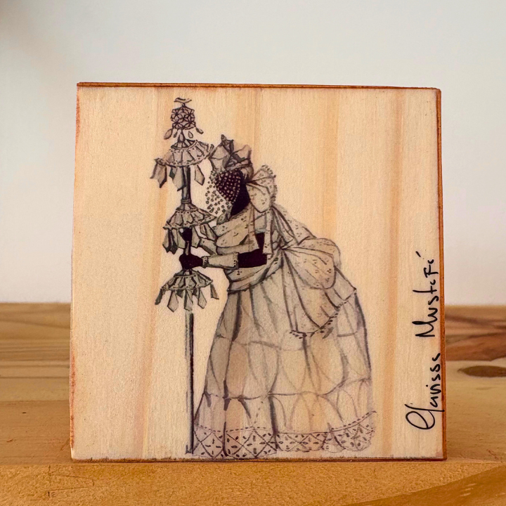 Peça em pinus cru (6x6x2cm) com reprodução de aquarela da artista Clarissa Mustafá em adesivo vinílico.