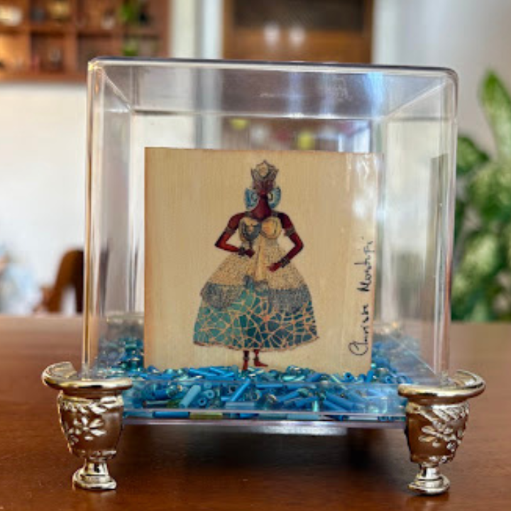 Peça em pinus cru (6x6x2cm) com reprodução de aquarela da artista Clarissa Mustafá em adesivo vinílico, dentro de caixa de acrílico 8x8cm